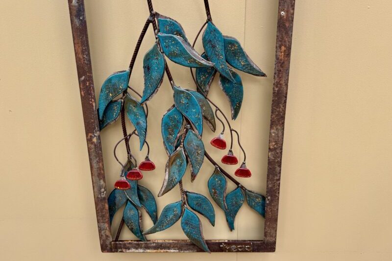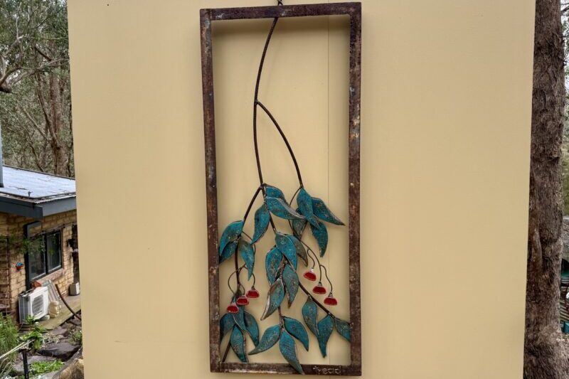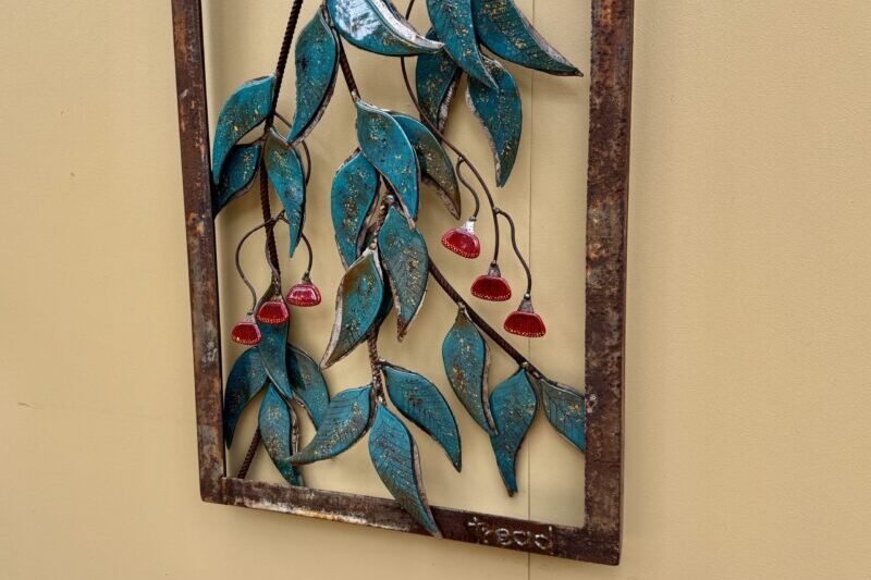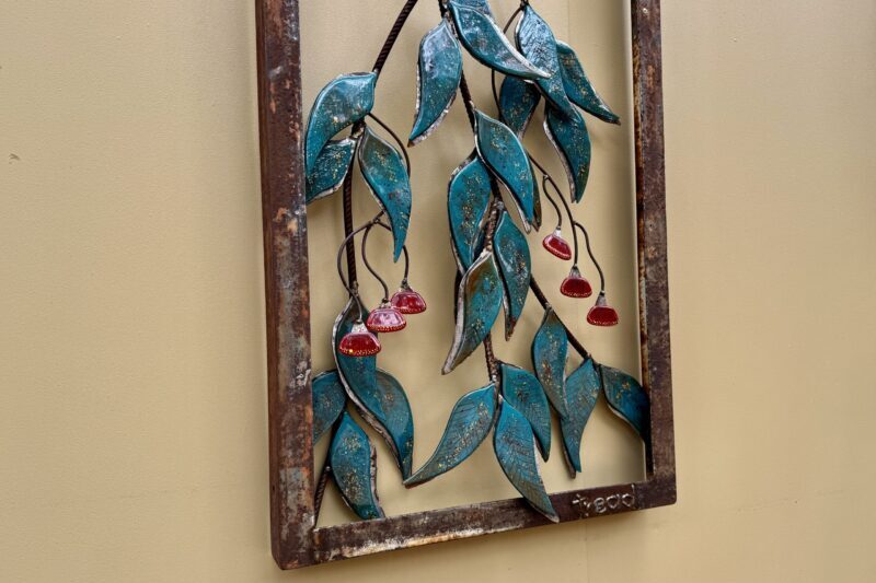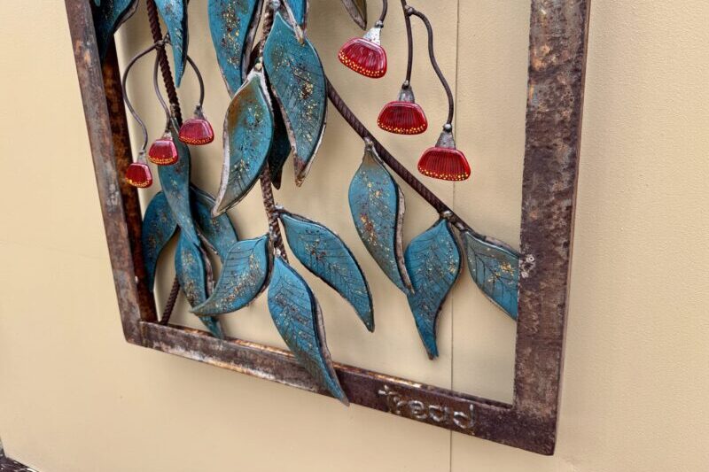 Steel branches are paired with glass gum leaves and gum flowers, bringing a shimmer of light and colour against the strength of the steel. A simple tribute to the beauty of the eucalyptus and the Australian bush.