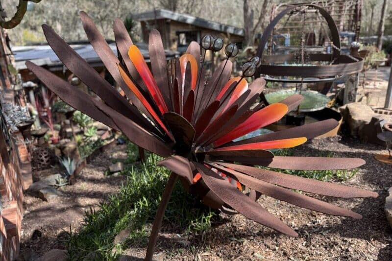 Made from reclaimed material including cut sections of light poles and decommissioned hot water service. I love the blend of the red/orange and rust on this flower and it will pop even more when settled into the greenery of a garden.