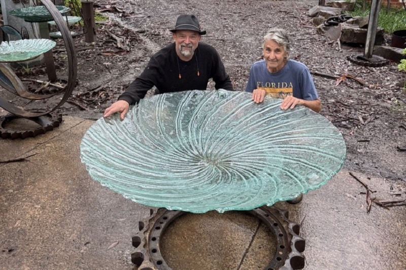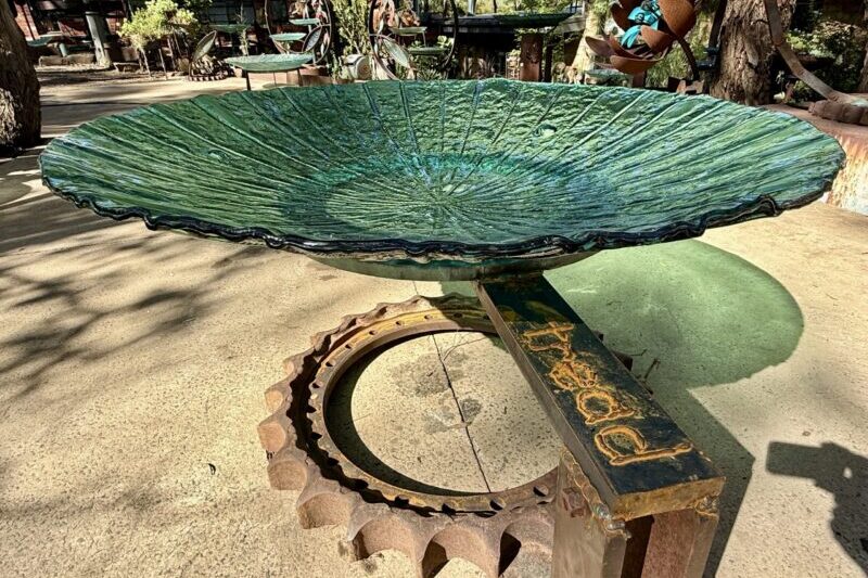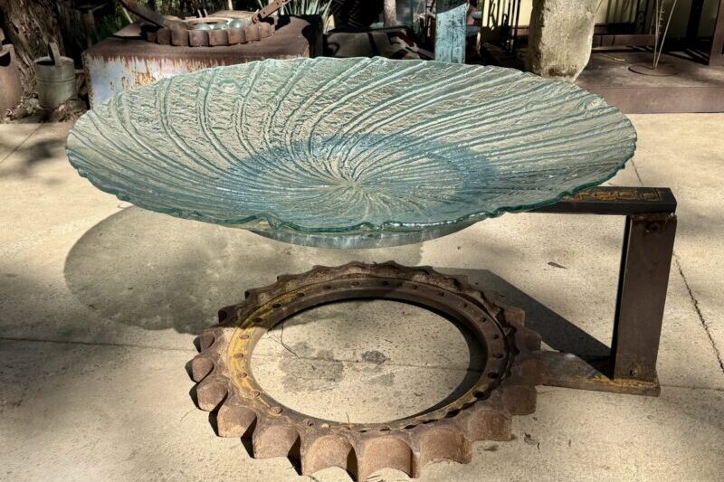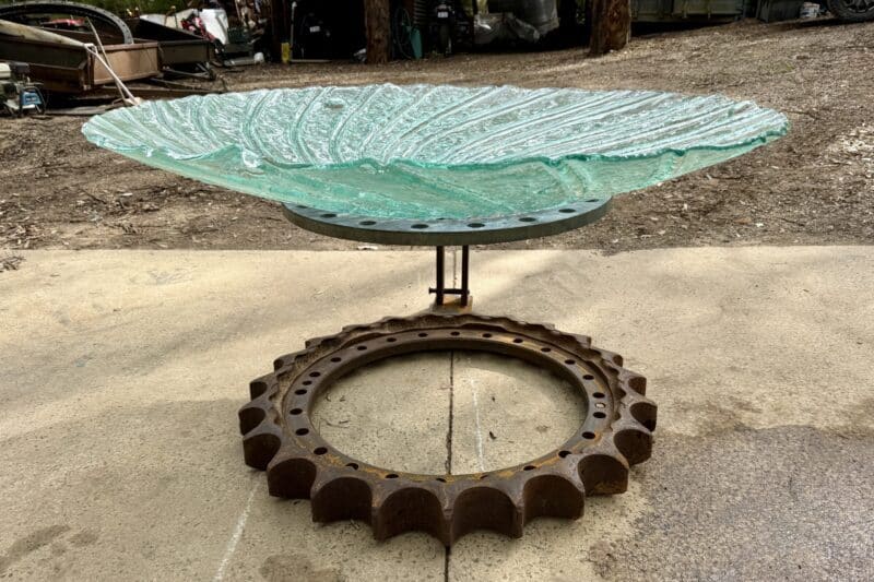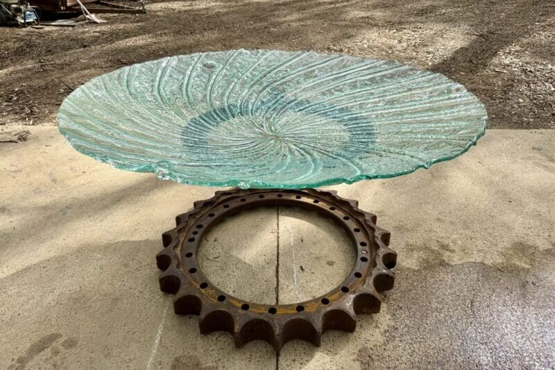 A giant reclaimed sprocket forms the base, with a cantilevered arm lifting The Breakaway vessel out beyond it.