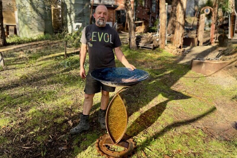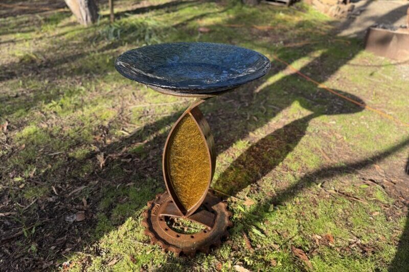 This freestanding birdbath has the metalwork sculpted first and then the glass leaf is slumped to suit.