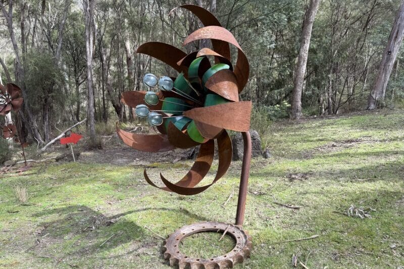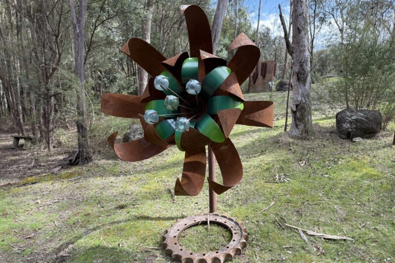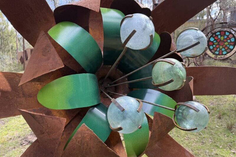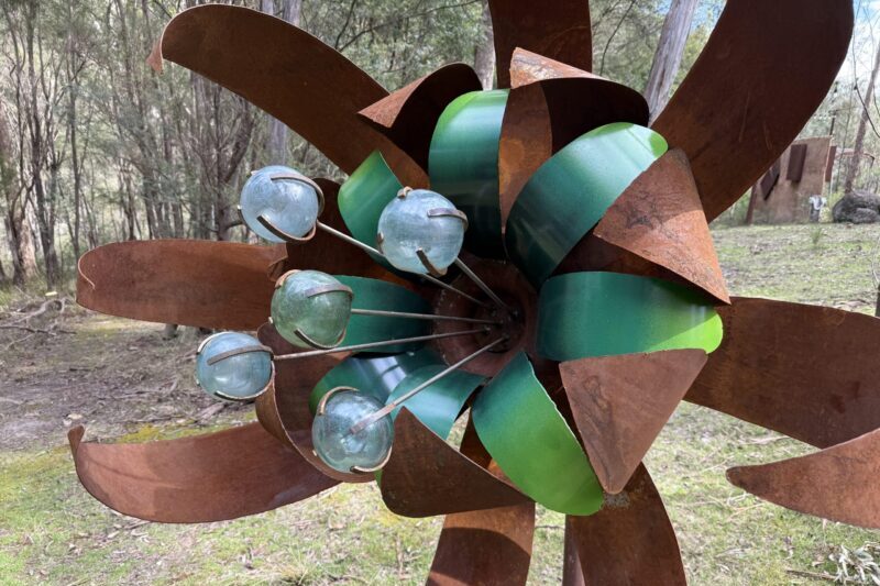 The wide petal spacing allows for a real contrast with the greenery as the rust develops and the reclaimed glass Japanese fishing floats will reflect light and give some extra sparkle at different times of the day.