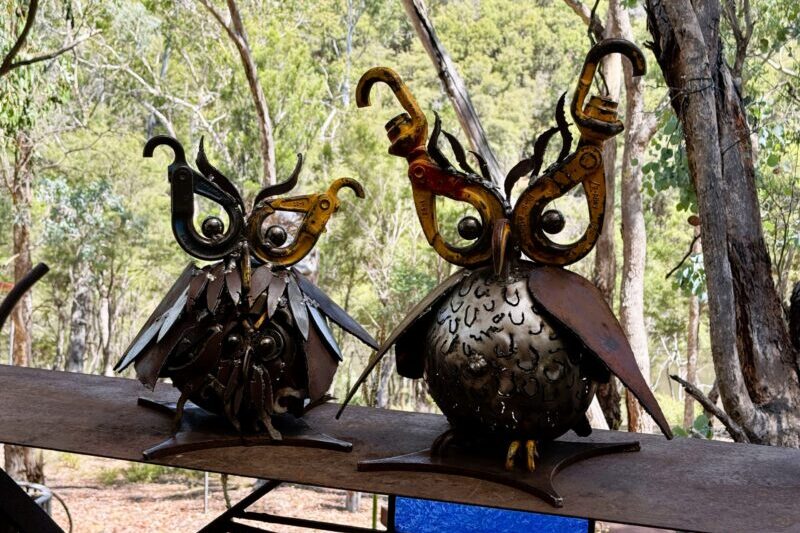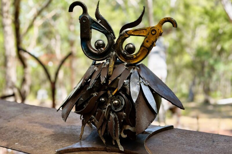 Honeys is a reclaimed steel owl sculpture built from hand-selected scrap and found metal components, shaped and assembled to give her a grounded, protective presence. Tucked beneath her wing is a small owlet — a quiet detail that speaks to care, shelter, and nurturing strength.