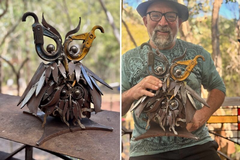 Like all my scrap-built birds, Honeys is formed intuitively — letting each salvaged part suggest feather, form, and expression — giving the sculpture its own unique personality.