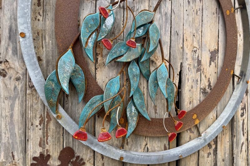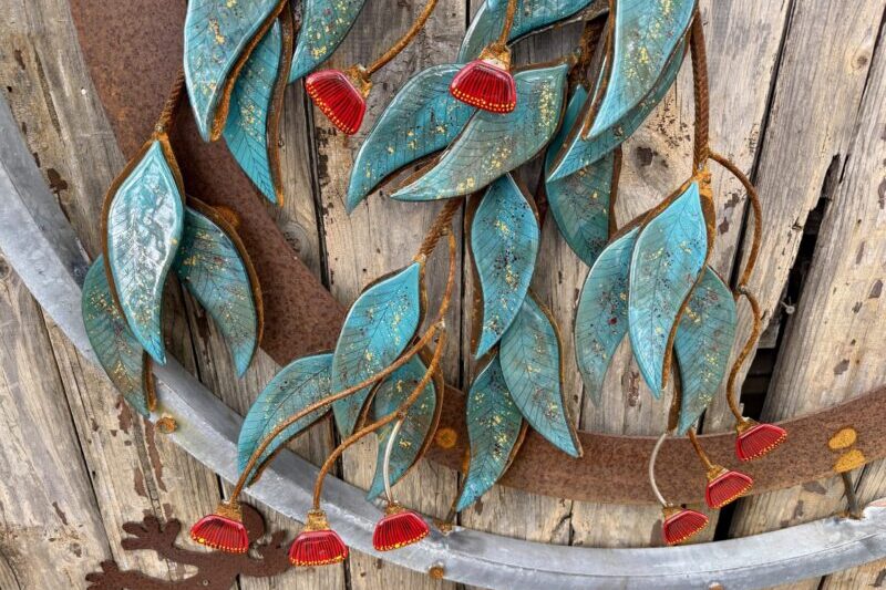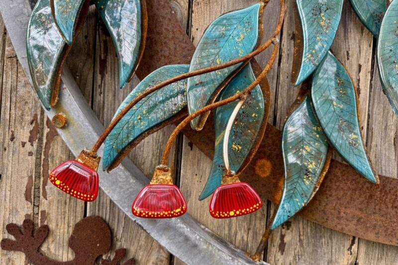 Red gum nut flowers are created with two pieces of hand cut fusible glass and detailed by hand with glaze, before being fused together in the kiln.