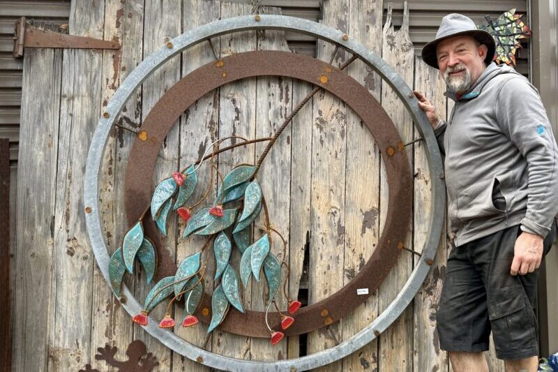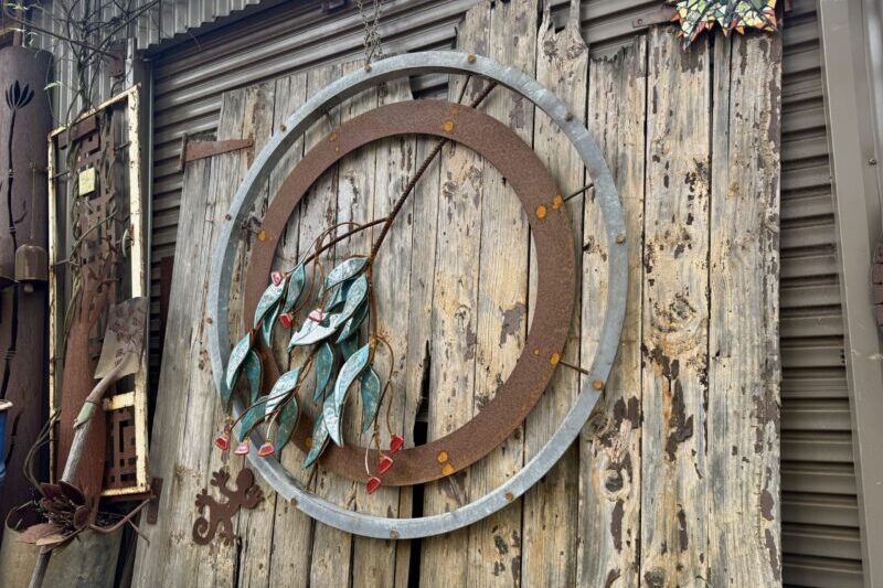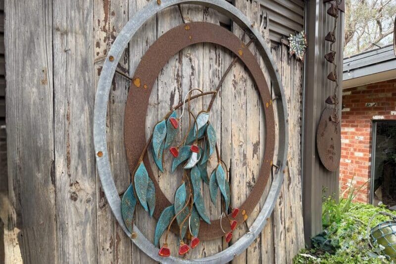 All the steel foliage for this piece is hand cut to form the backing for Rob’s glass leaves that are also hand cut, hand glazed, and then fired in the kiln.