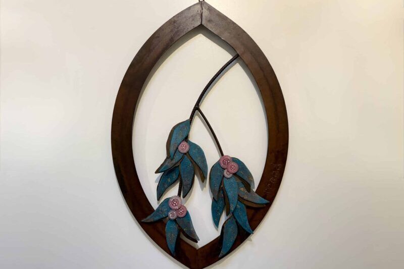 The detailing on these glass leaves and flowers beautifully compliments the rusty earthiness of the tear drop frame, as a true reflection of what we are surrounded by when in the Australian bush.