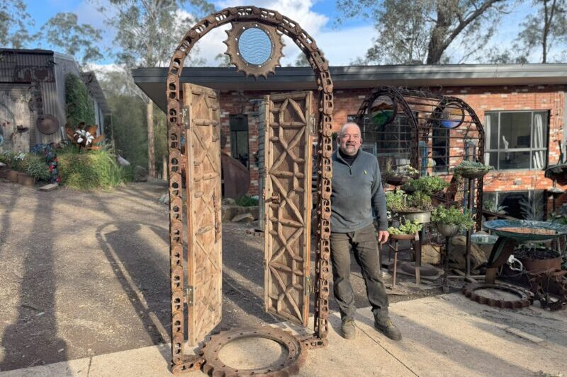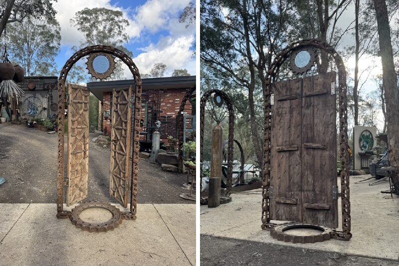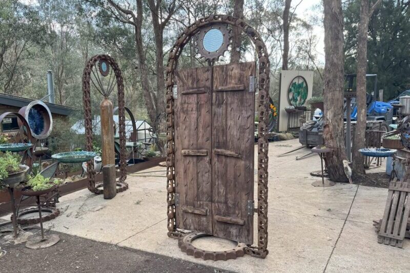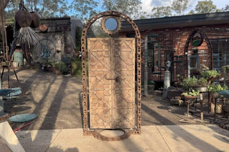 This entrance is built from a reclaimed excavator chain, 150-year-old teak doors from Rajasthan, and a blue glass dial set in a steel sprocket. Once made for movement and labour, these parts now form a quiet passage into the garden.