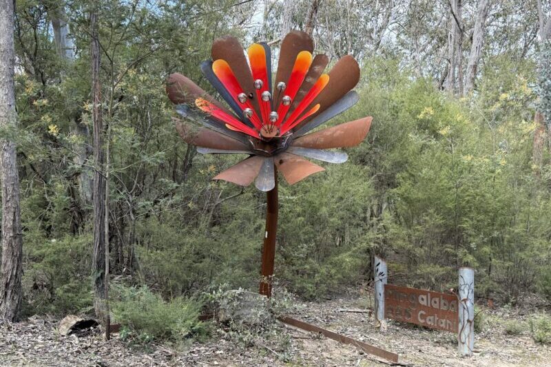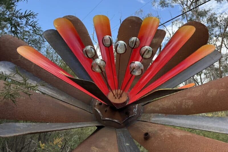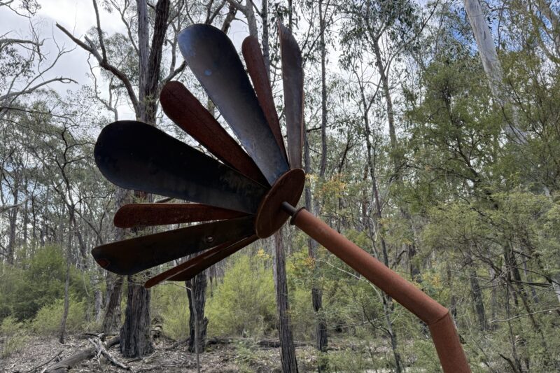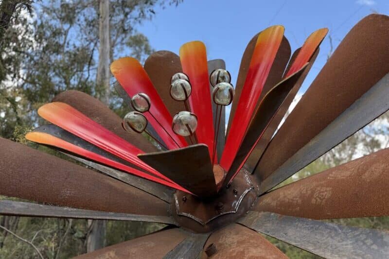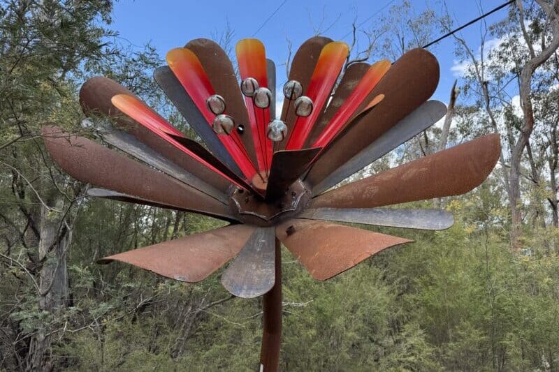 Set at the entrance to Tread Sculpture this huge flower is made from 100% reclaimed material including two commercial boiler tanks that form the petals and the centre.